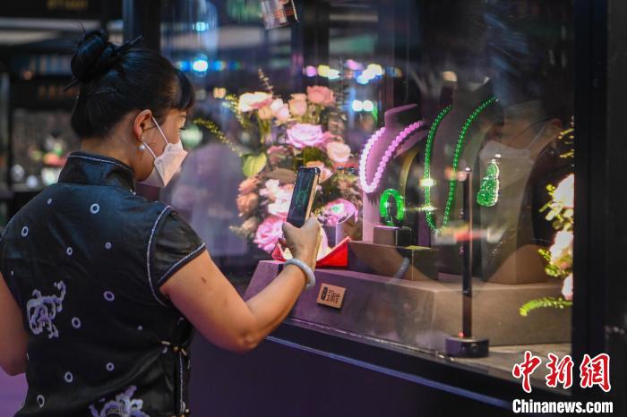 7月11日,展出的翡翠饰品吸引参观者拍照。当日,2024中国昆明国际石博览会暨云南国际珠宝玉石展开幕,本届石博会围绕“珠宝玉石、赏石文化、非遗工艺”三大核心板块,设置国际品牌珠宝馆、时尚首饰馆、玉石翡翠馆、奇石馆、工艺美术馆。 中新社记者李嘉娴摄