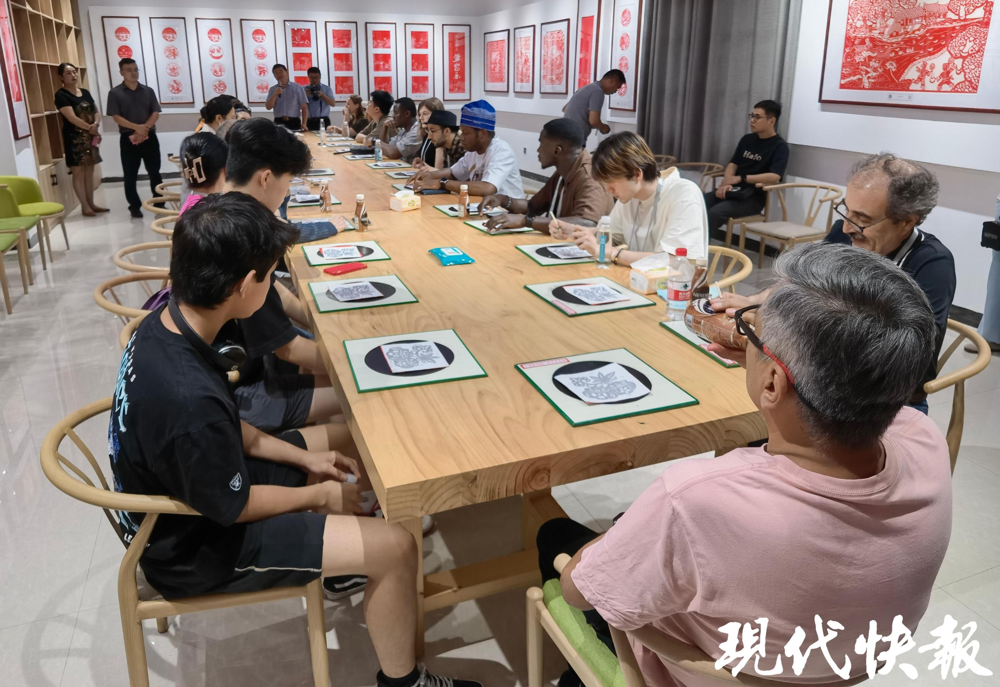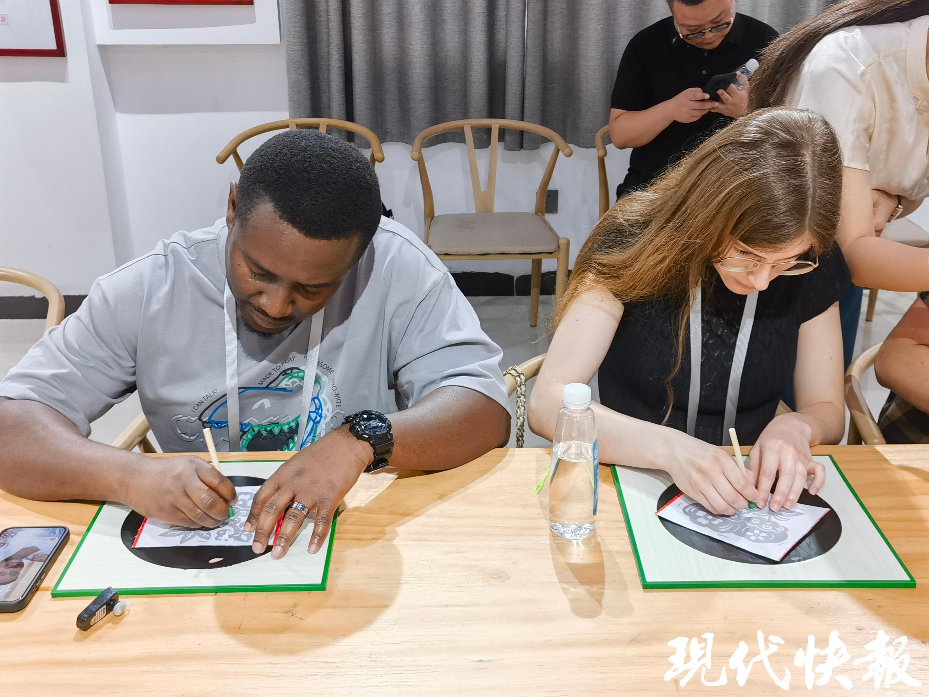 在刻纸门花传承基地,外籍友人体验了非遗刻纸。现场,半城刻纸代表性传承人为大家准备了“柿柿如意”的图案,并耐心讲解、指导刻纸步骤。