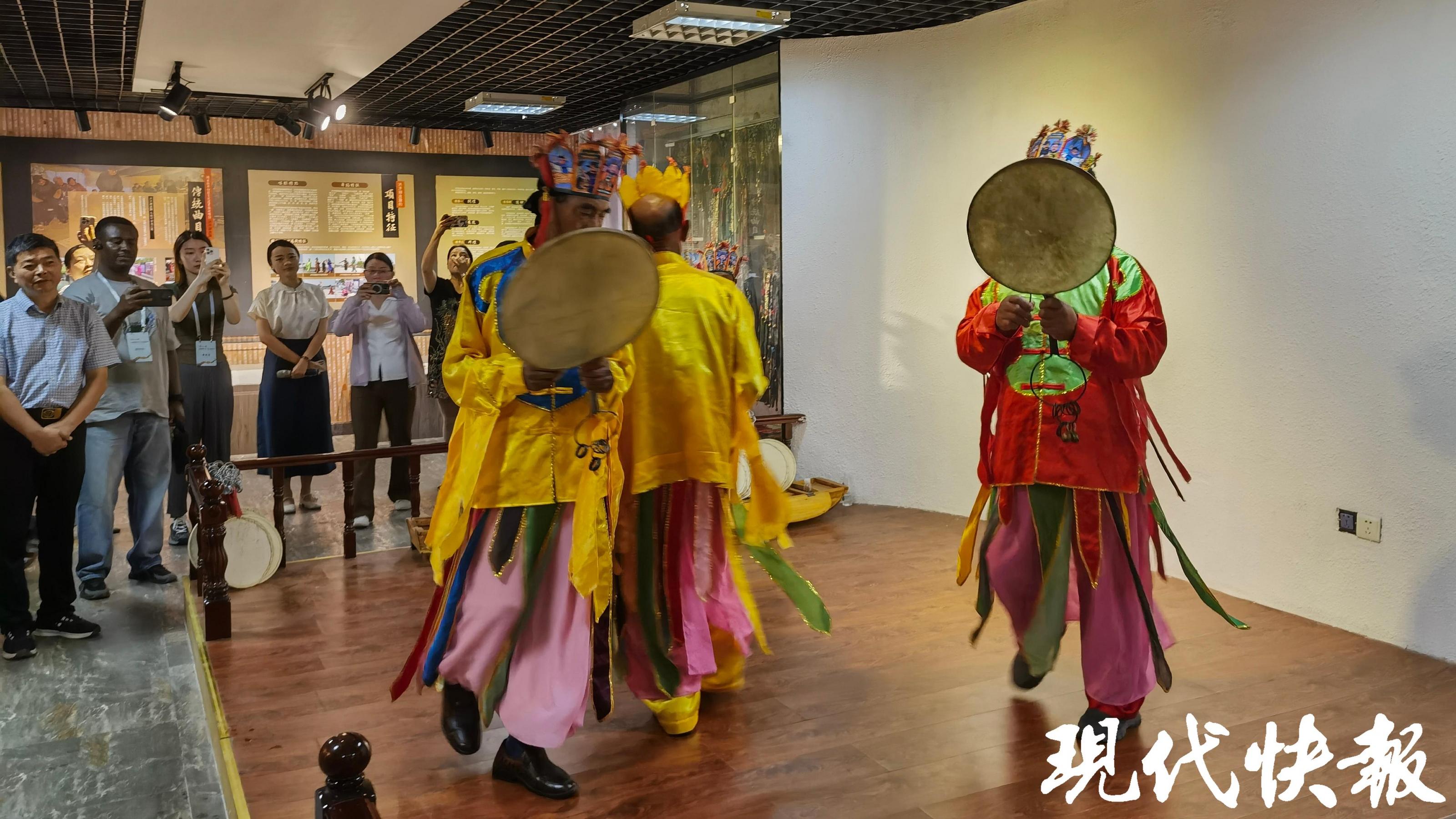 7月10日下午,外籍友人走进洪泽湖民俗博物馆,观看了洪泽湖渔鼓的表演。初次接触这项传统艺术的外国人,被渔鼓的鼓点节奏、舞蹈的活力深深吸引,纷纷拿出手机拍照记录。