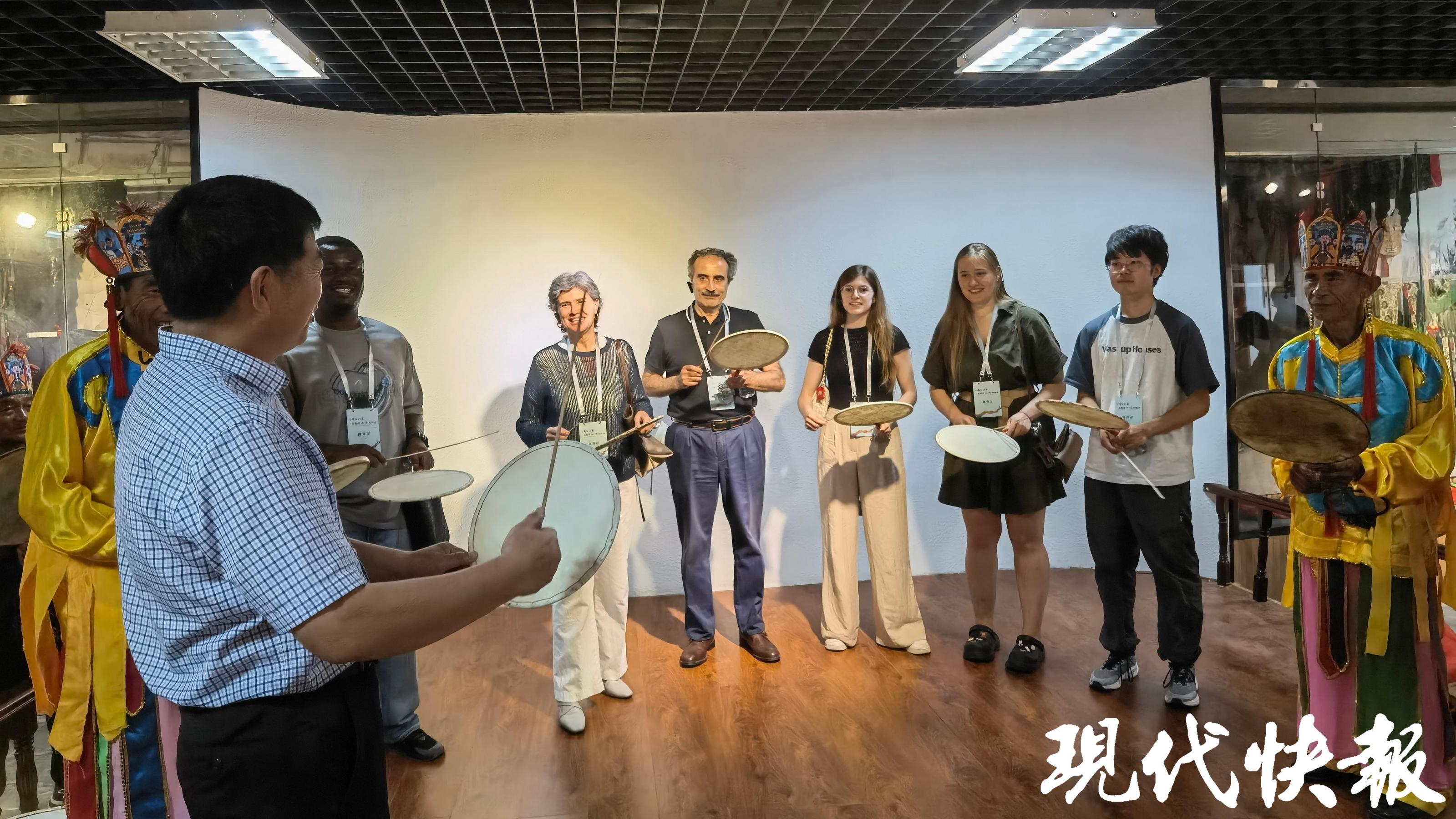 “一二三,一二三,一二三四五六七……”现场,外籍友人还跟着专业大师,学习如何敲击渔鼓,亲身体验这项非遗的独特魅力。“学得超快,很有天赋!”外国朋友们很快掌握了敲击技巧和节奏,收获现场非遗传承人点赞。