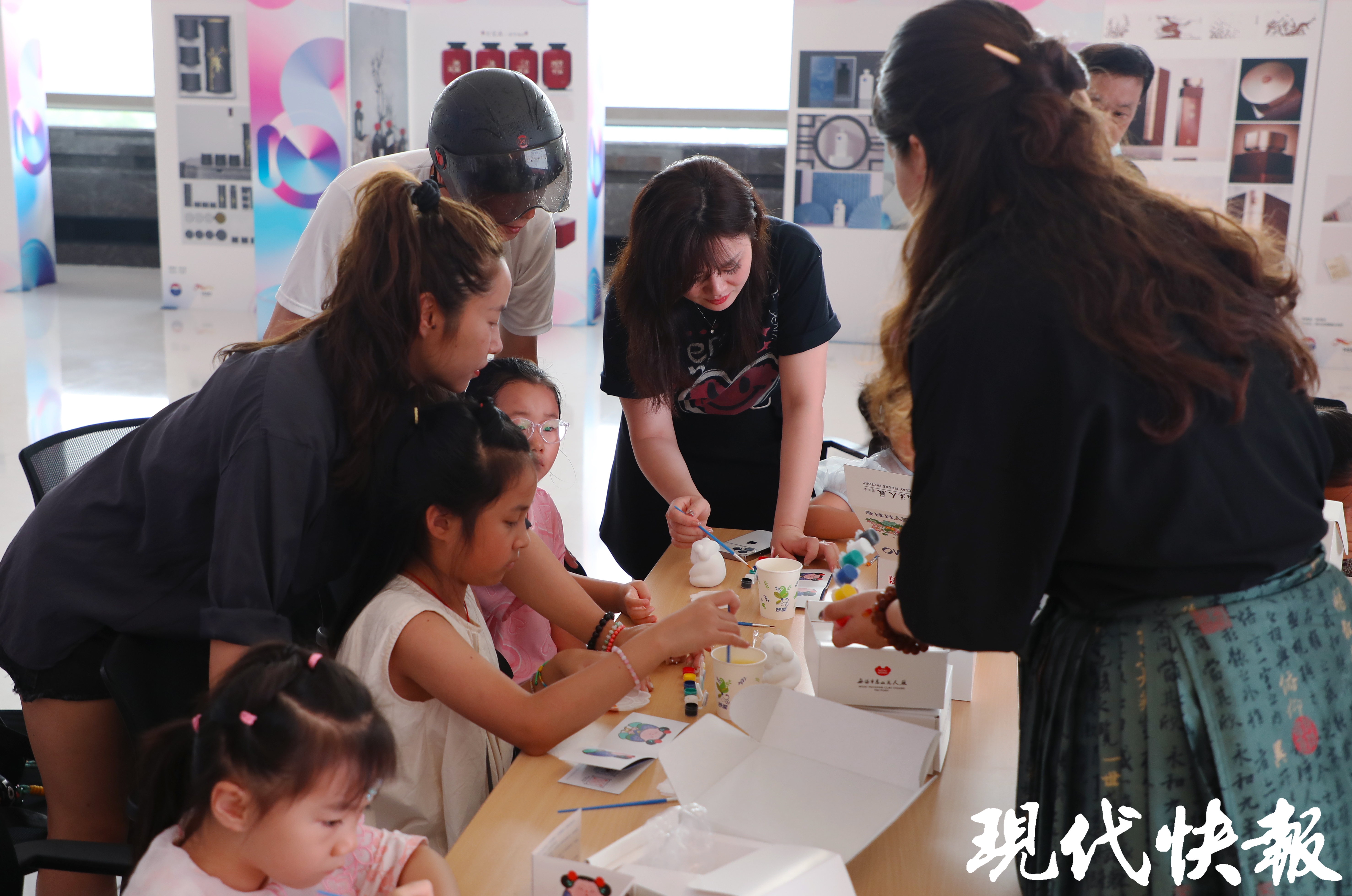 有相同感受的是一位“小体验官”,她拿着自己创作的作品向记者介绍,惠山泥人造型可爱,加上今天在展馆内看了很多创意作品,于是她把汲取的灵感用在了她的作品上,泥人身上的那一抹紫,正是和“紫金奖”有了呼应。