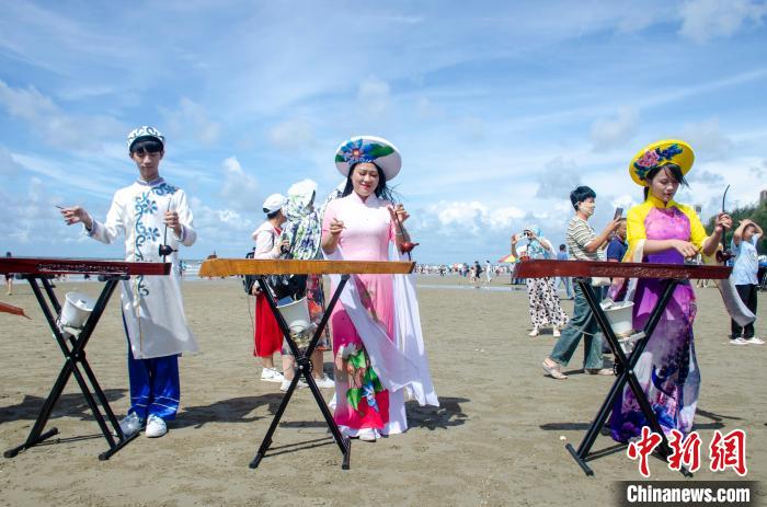 京族哈节的形成源远流长,民间传说颇多,历经几百年的传承和演变,其形式和内容更加丰富多彩。如今在哈节期间,独弦琴演奏、踩高跷捕鱼等,京族传统的民俗文化展演已成为固定节目。14日当天,在金滩上,国家级非遗项目京族独弦琴艺术自治区级传承人苏海珍领着京族青年男女共同演奏独弦琴,悠扬的琴声,耳熟能详的曲调,吸引了不少游客驻足欣赏。踩高跷捕鱼、耙螺等京族传统的生产方式展演亦令人跃跃欲试。