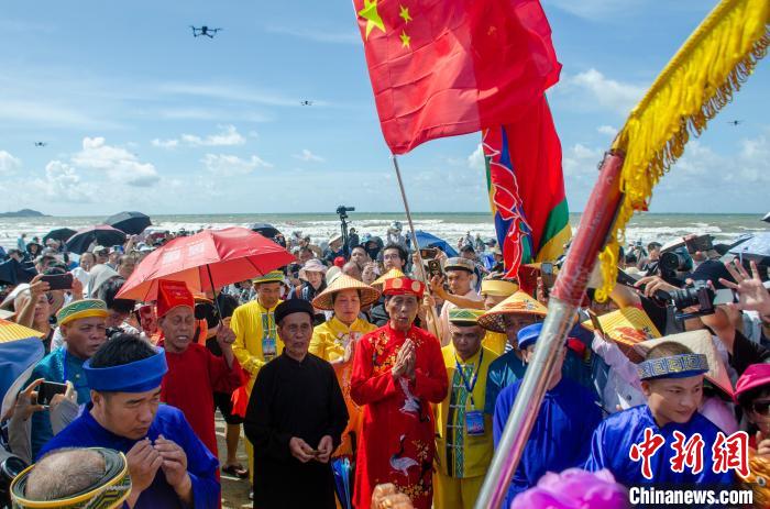 中新网防城港7月14日电(翟李强蒙鸣明王伟臣)7月14日,农历六月初九,京族传统民族盛典——哈节在广西防城港隆重举行,京族民众穿着民族服饰,浩浩荡荡地到海边迎神祈福。