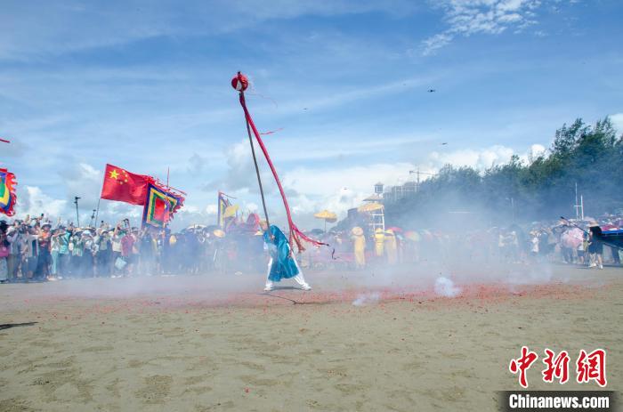 14日上午,京族民众和慕名而来的游客早早就汇聚于哈亭,这里是京族民众祀祖、祭神和民间娱乐的公众场所,现场摩肩接踵。哈亭前的国旗升起后,在几名京族长者的带领下,由京族男女老少,以及来自越南的嘉宾组成的迎神队伍,推着神坛向着大海的方向徐徐出发。在金滩上,迎神队伍朝着大海的东南方向,一番仪式过后,将神迎回哈亭敬奉。一路上,游客紧紧相随,争睹为快。