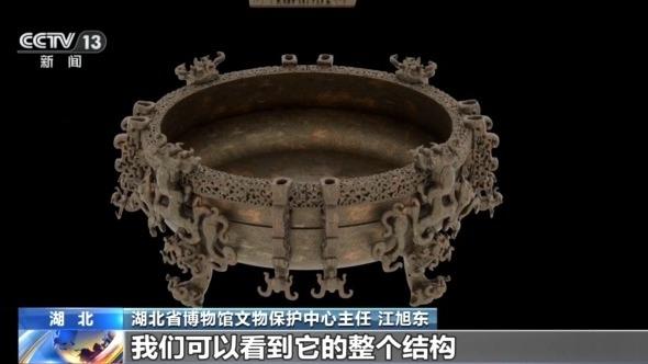 湖北省博物馆文物保护中心主任 江旭东:这个尊盘它是古代最复杂、最精美的一件青铜器,它的精美之处在于它有很多镂空的结构。而且这种镂空的结构,到目前为止还没有办法进行复制。通过对结构数字化的复原,我们可以看到它的整个结构,尊和盘一共加起来有100多个部件组成。它纹饰上面分了高浮雕、圆雕、透雕很多这种工艺,非常复杂。