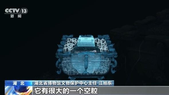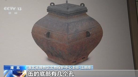 湖北省博物馆文物保护中心主任 江旭东:这件器物有一个比较特别的构造,我们可以看到,缶放在鉴里面,它有很大的一个空腔。空腔在古代其实就是用来装冰或者是装热水的,在夏天的时候装冰就可以起到冰酒的作用,所以也被称为古代最早的冰箱。