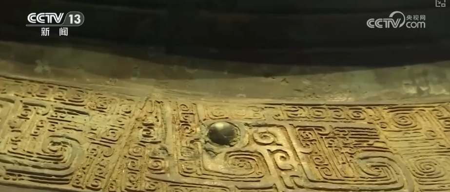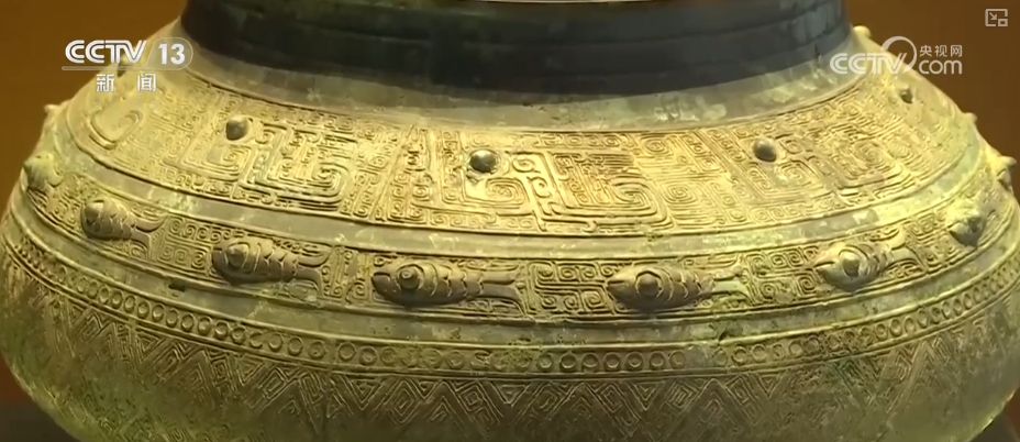 这件器物看起来“肚子”圆鼓鼓,上面布满了云雷纹和卷云纹,最吸睛之处是腹部上方的一圈鱼形纹饰,细腻精致、动感十足。