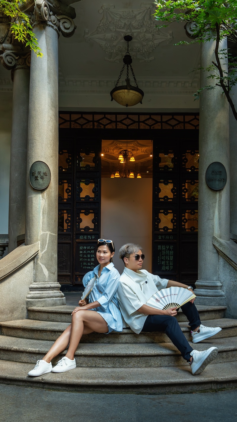 中国香港艺术家组合“Jay&Maggie”(梁家耀、莫诗韵)在新天地壹号门前合影。樊晔亲图