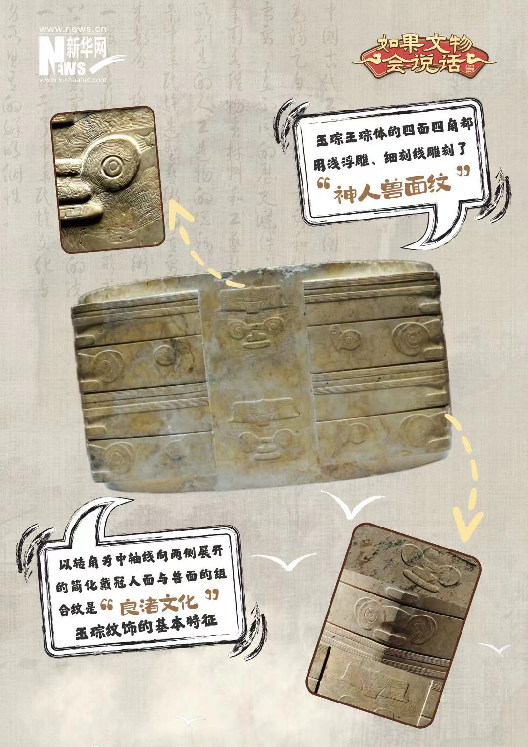 玉琮王的奇特之处更在于其四面琢刻的“神徽”。浙江省文物考古研究所相关负责人表示,在发现玉琮王之初,考古人员并未过多关注玉琮上的纹饰。在它被送往文物库房进行编号、拍照之后,考古人员才发现,玉琮王上竟刻画着头戴羽毛发冠、骑在神兽之上的“神人兽面”图案。