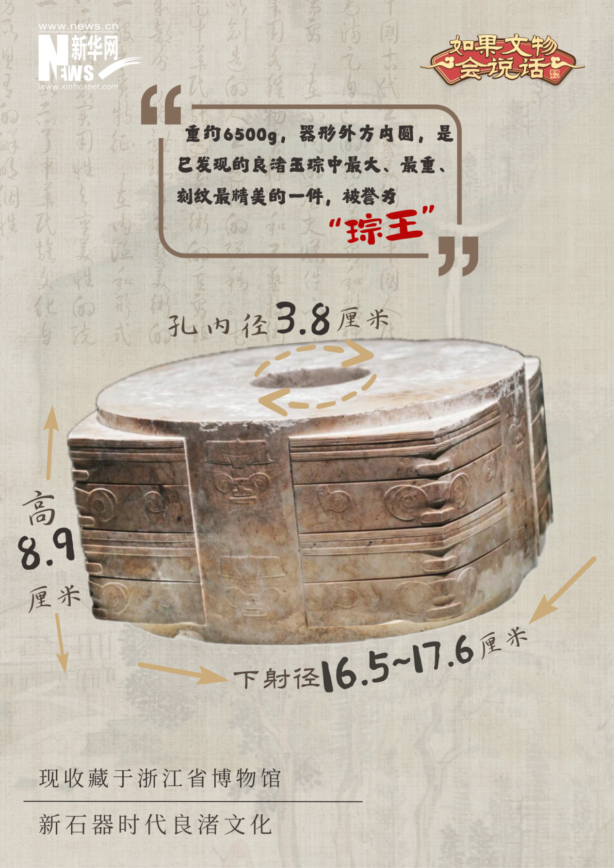 玉琮王通高8.9厘米,上射径17.1厘米至17.6厘米,下射径16.5厘米至17.5厘米,孔内径3.8厘米,器形外方内圆,是已发现的良渚玉琮中最大、最重、刻纹最精美的一件。