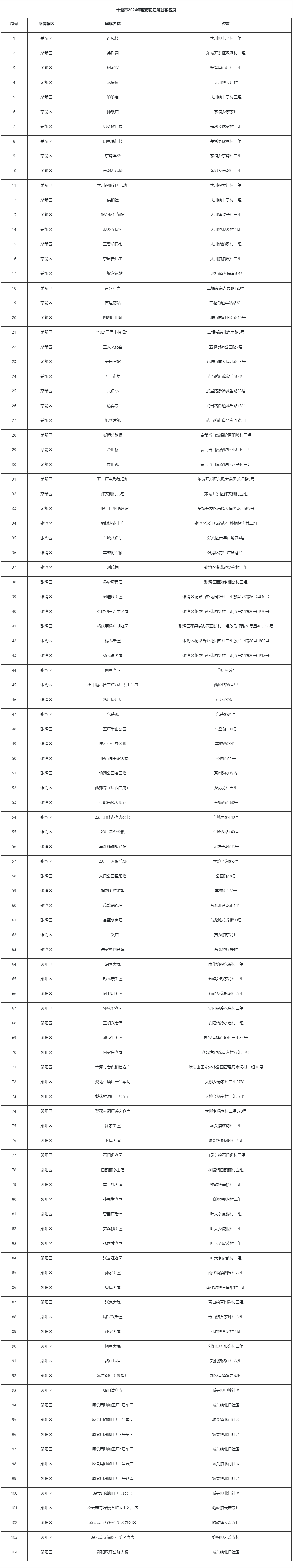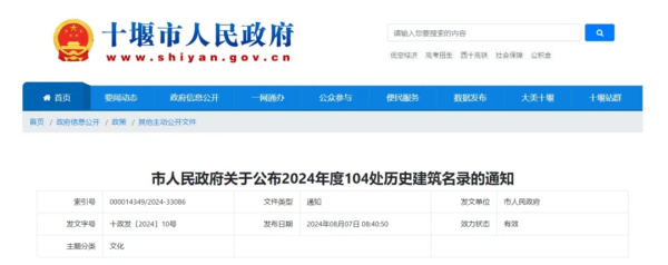为加强我市历史建筑保护管理,更好地传承历史文化,保留历史记忆,彰显地域特色,按照住建部《历史文化街区划定和历史建筑确定工作方案》(建办规函〔2016〕681号)、《关于进一步加强历史文化街区和历史建筑保护工作的通知》(建办科〔2021〕2号)确定的历史建筑保护公布程序,经研究,确定嘉庆桥、胡家大院等104处建筑为“十堰市历史建筑”,列入2024年历史建筑名录,现予以公布。