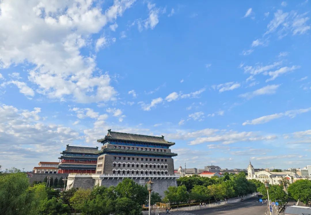 △蓝天白云下的毛主席纪念堂、正阳门城楼、正阳门箭楼(左至右,5月31日摄)。新华社记者 陈晔华 摄