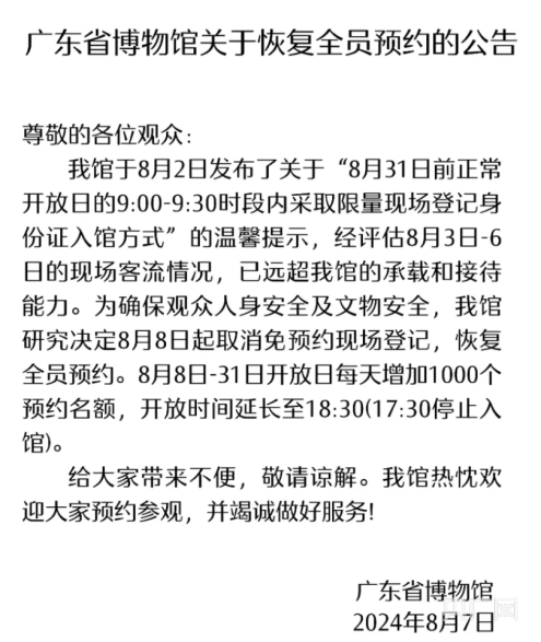 此前,其官方公众号发布公告:“经评估8月3日-6日的现场客流情况,已远超我馆的承载和接待能力。为确保观众人身安全及文物安全,我馆研究决定8月8日起取消免预约现场登记,恢复全员预约。”稍早前的8月2日,广东省博物馆曾发布关于“8月31日前正常开放日的9:00-9:30时段内采取限量现场登记身份证入馆方式”的温馨提醒。