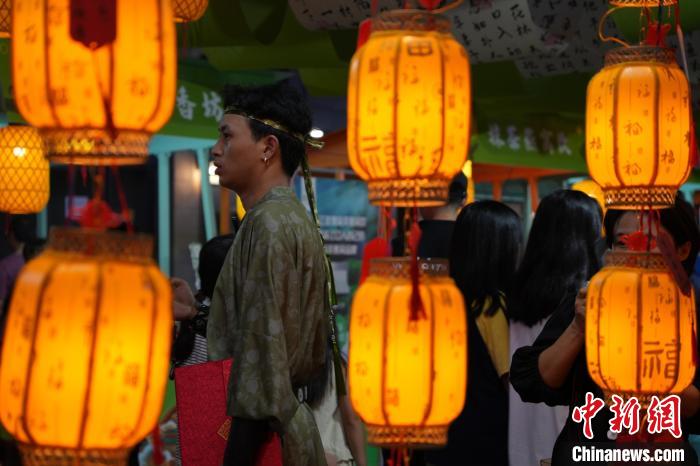 华灯初上,抹茶雅集上的灯笼随风摇曳,三五成群身着古代服饰的年轻人,衣袂翩翩、款款而行,品美食、赏歌舞,共享七夕浪漫时光。