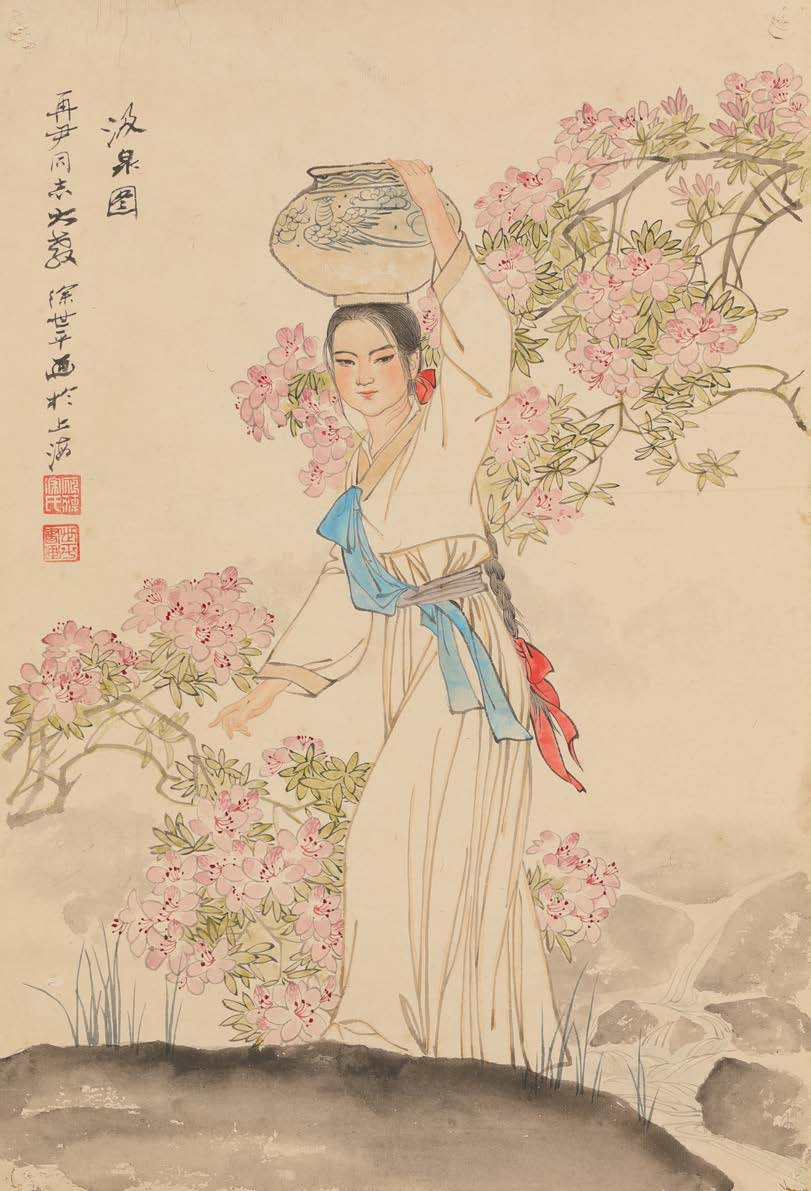 展出的徐世平书画包括各时期、各阶段的代表作,最早的是他11岁的习字,以及早期人物画作,跟随王己千先生后的山水画临摹及创作等,其中有一件《汲泉图(朝鲜姑娘)》是他年轻时为追求其夫人而精心绘制的,画上的落款则是其父亲徐伯清代书。