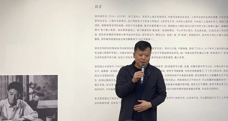 此次展览展出书法家徐伯清先生及其子徐世平创作于各时期的50件书画作品。策展人、古书画收藏家颜明在开幕式上表示,他与徐伯清、徐世平父子都是至交好友,展览源于2个月前徐世平先生的突然辞世,“当时十分悲痛,用这样一种书画展的方式来纪念好友,也算是对好友的缅怀了。”