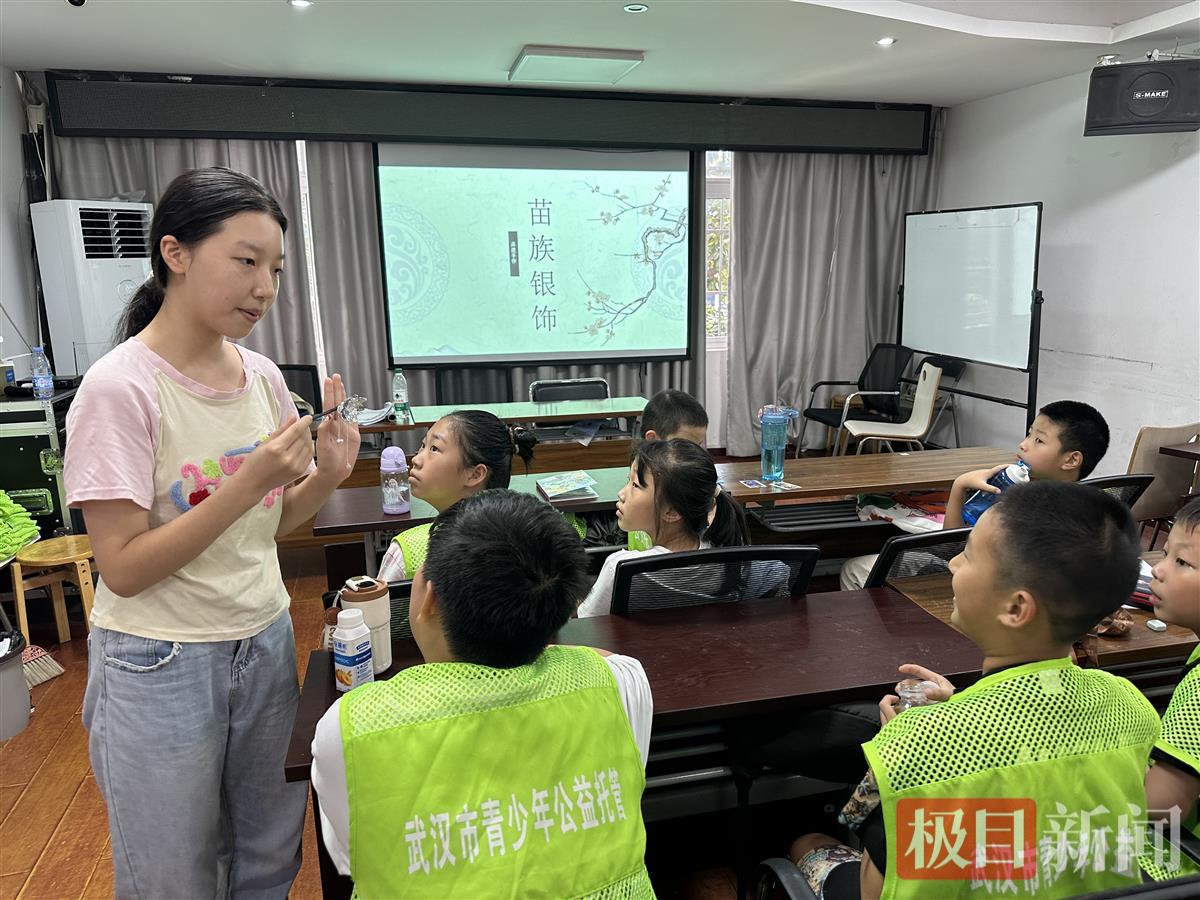 课堂上,白花花、银灿灿的苗族银饰一下子吸引了孩子们的注意力,志愿者老师向孩子们介绍了苗族的历史、服饰、音乐、舞蹈等传统文化元素。孩子们听得津津有味,不时发出惊叹声,对苗族文化产生了浓厚的兴趣。在老师的带领下,他们巧妙利用手中的锡箔纸制作出了各式各样的造型,有的人制作了精美的发簪和手镯,有的则设计了银盔与宝剑。