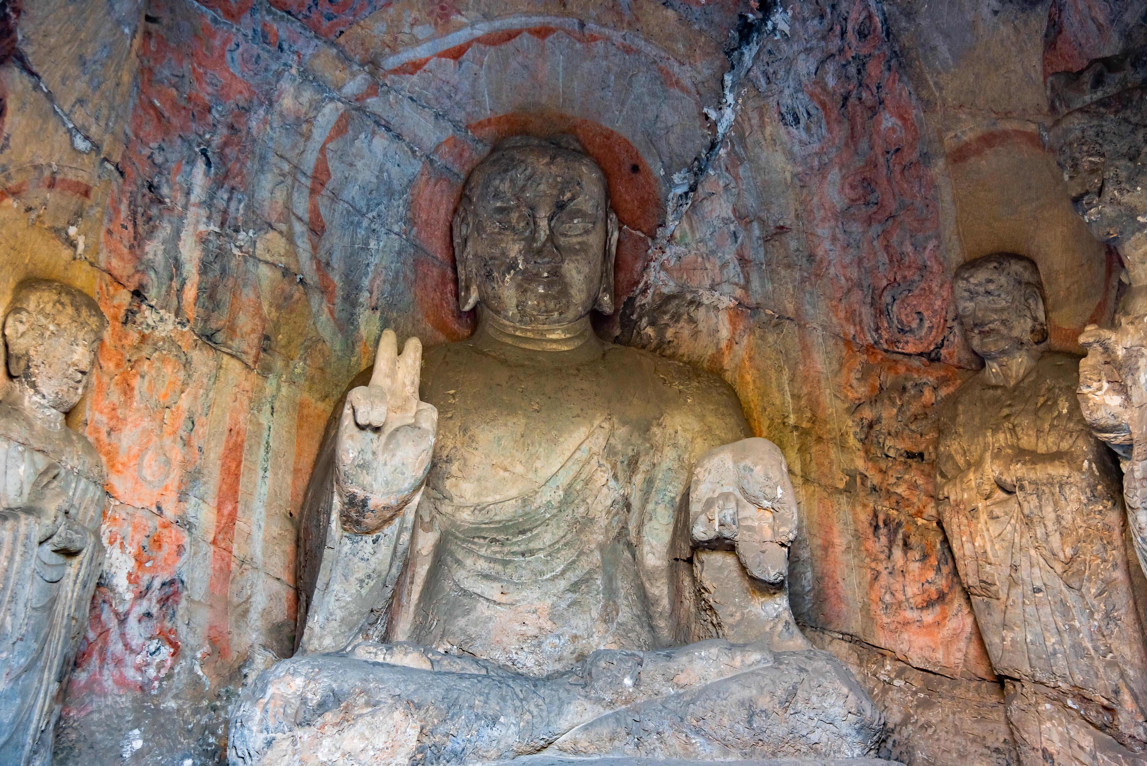 “其实这是一个有趣的误会,原本这尊佛像的手势是三指,是一种佛教手印。但大拇指断掉了,缺了一个手指头才巧合地成了剪刀手。”龙门石窟金牌讲解员马丁介绍道,佛教手印是佛教修行者用双手及手指结合做出各种姿势,配合念诵佛经,以此更快地达到修行成功的目的。宾阳北洞正壁主尊佛像的特殊手势就是一种极少见的佛教手印,这种手印或与唐代密宗修行有关系。
