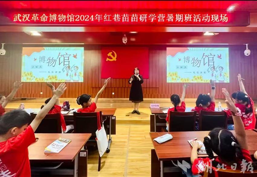 “红巷苗苗研学营”是武汉革命博物馆专门培养青少年志愿者的品牌社教项目,累计培养了2000多名“红巷苗苗”。暑假伊始,暑期“红巷苗苗研学营”如期而至。课程设计上,在传统的形体发音、讲解礼仪、红色文化等基础课程外,新增沉浸式思政课《监委主席王荷波》、讲解课《光辉的起点——中共五大会址》、互动课《如何讲好红色故事》三堂专业课,同时引入美育课《武昌十景》、手工体验课《闪闪扣红心》等素质课程,形成“基础+专业+素质”课程相结合的体系,全面提升“红巷苗苗”素养。