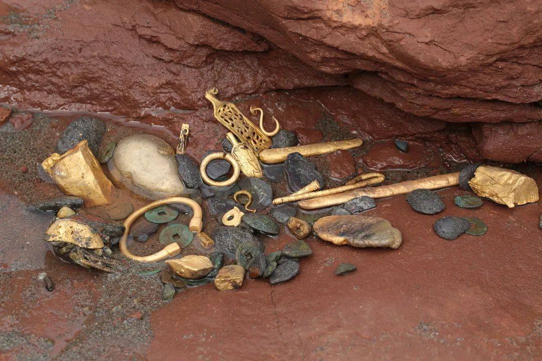 周羿杨:一共有三方面的原因。首先,我们做了等比例的研究,等比例地缩放了河床的石子、银锭,做了一个水流冲击实验,证明了确实不会有太大的位移,因此帮助我们确认了,这里就是第一战场。其次,考古现场有一个现象,就是同类型的东西,在同一个地方形成了一个富集。很有可能是当时的人把同类型的东西进行了分箱装,才会出现这么一个堆积的现象。还有就是,江口崖墓的山体为红砂石,整个河床也是。红砂石的质地较软,贵重金属掉下去之后,基本就会嵌在砂石里头,会有一些嵌痕。通过考古发掘,我们也看到了这些嵌痕。所以可以肯定,这些文物就是在原位沉下去的,并没有较大的位移。其实,考古就跟刑侦案拼凑线索一个道理,去反推当时发生的一些事情。
