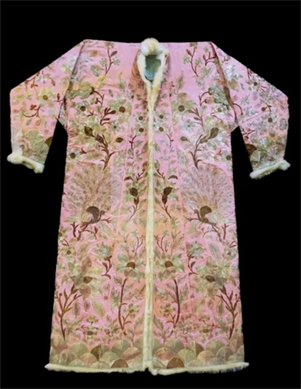 例如,槟城娘惹新娘的长衫为丝绸锦缎制作,金银线绣花装饰,整件服装饰有兔毛饰边,华丽而庄严。槟城“峇峇、娘惹”博物馆中有一件娘惹新娘回娘家长衫藏品,年代在19世纪末20世纪初,浅粉色的真丝长衫,衣身上绣满各种吉祥图案,有向上生长的兰花、菊花、荷花,开屏的孔雀,下摆和袖口绣有层层波浪,各类图案呈对称式布局。浅绿松石滚边和兔毛饰边环绕颈部,一直沿门襟向下延续到袖口及下摆,形成服饰的统一和谐。