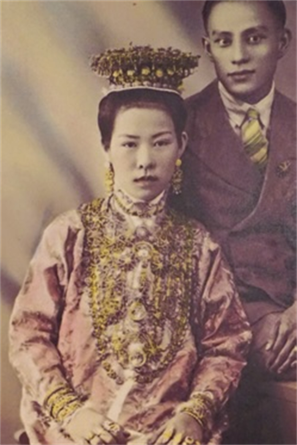 娘惹新娘在回娘家时通常会佩戴各种发箍头饰,这类头饰因其造型像盛开的花,故称“花冠”。有一张20世纪“峇峇、娘惹”新人在婚礼第三天留下的珍贵影像,影像中的新娘正是梳着花冠发型。