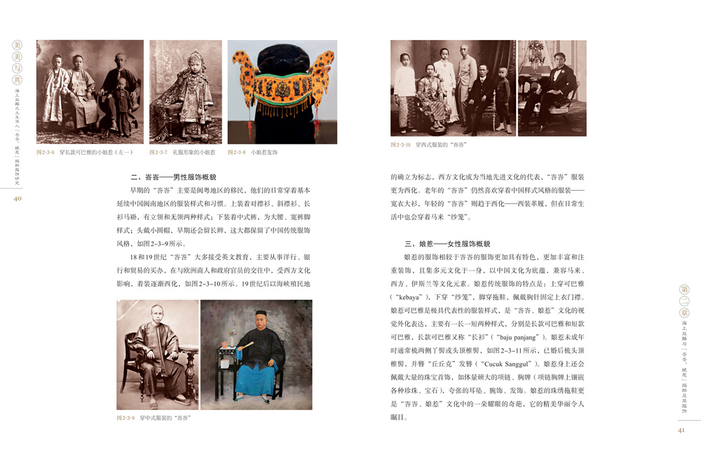 书的第一、二章从实地考察入手,以史为纲目,跨学科互渗式研究,总结剖析各个层面的相关学术理论和综合论述,理清“海上丝绸之路”、“土生华人”、“峇峇、娘惹”等概念。阐述海上丝路与“峇峇、娘惹”族群的关系,族群的中国起源和特征,及“峇峇、娘惹”服饰的概况和风俗文化。