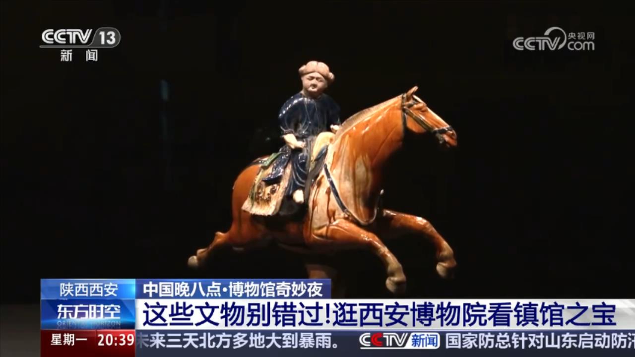 最吸引人、名气最大的,当然是唐三彩,其中,比较有名的唐三彩腾空马。这座腾空马造型由两部分组成:胡人骑马俑、腾空飞奔之马。以生动、逼真的造型,鲜美的釉色,成为唐三彩中的精品。