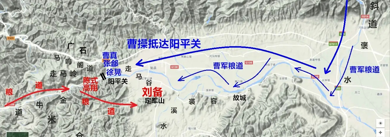 刘备最终驻扎在汉中盆地西南角的定军山,对夏侯渊后方补给线构成威胁。