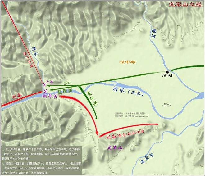 公元219年,刘备从阳平关,南渡沔水,于定军山扎营,夏侯渊率军来抢定军山。