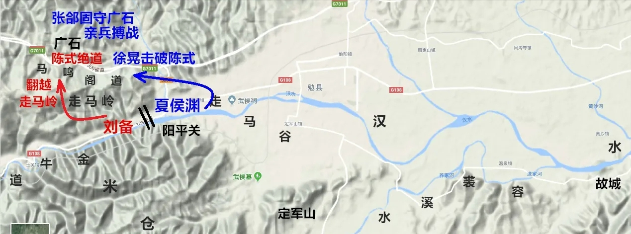 也就是说夏侯渊将刘备缠住,而关中来援的魏军正在路上。等魏军援军击败了刘备所有偏师从陈仓道方向过来,刘备就会陷入腹背受敌。