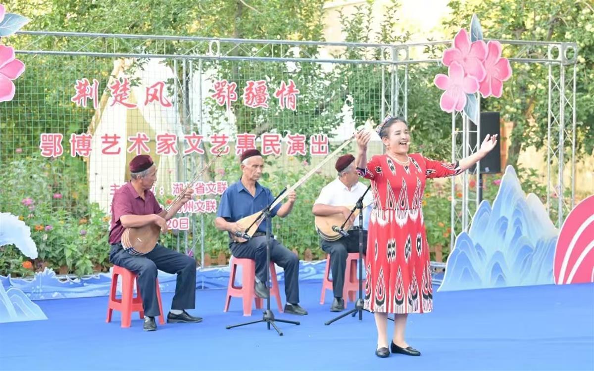 展览开幕式后,荆楚“红色文艺轻骑兵”走进博州文艺宣讲惠民演出暨湖北民族舞蹈培训成果展演。本地艺术家们也奉献了风情浓郁、异彩纷呈的节目:马头琴合奏《万马奔腾》《草原连着北京》,哈萨克民歌独唱《玛依拉变奏曲》,女声三人小合唱《我和草原有个约定》,冬布拉弹唱《美丽的姑娘》,歌曲联唱《感谢亲爱的共产党》《相聚博尔塔拉》……