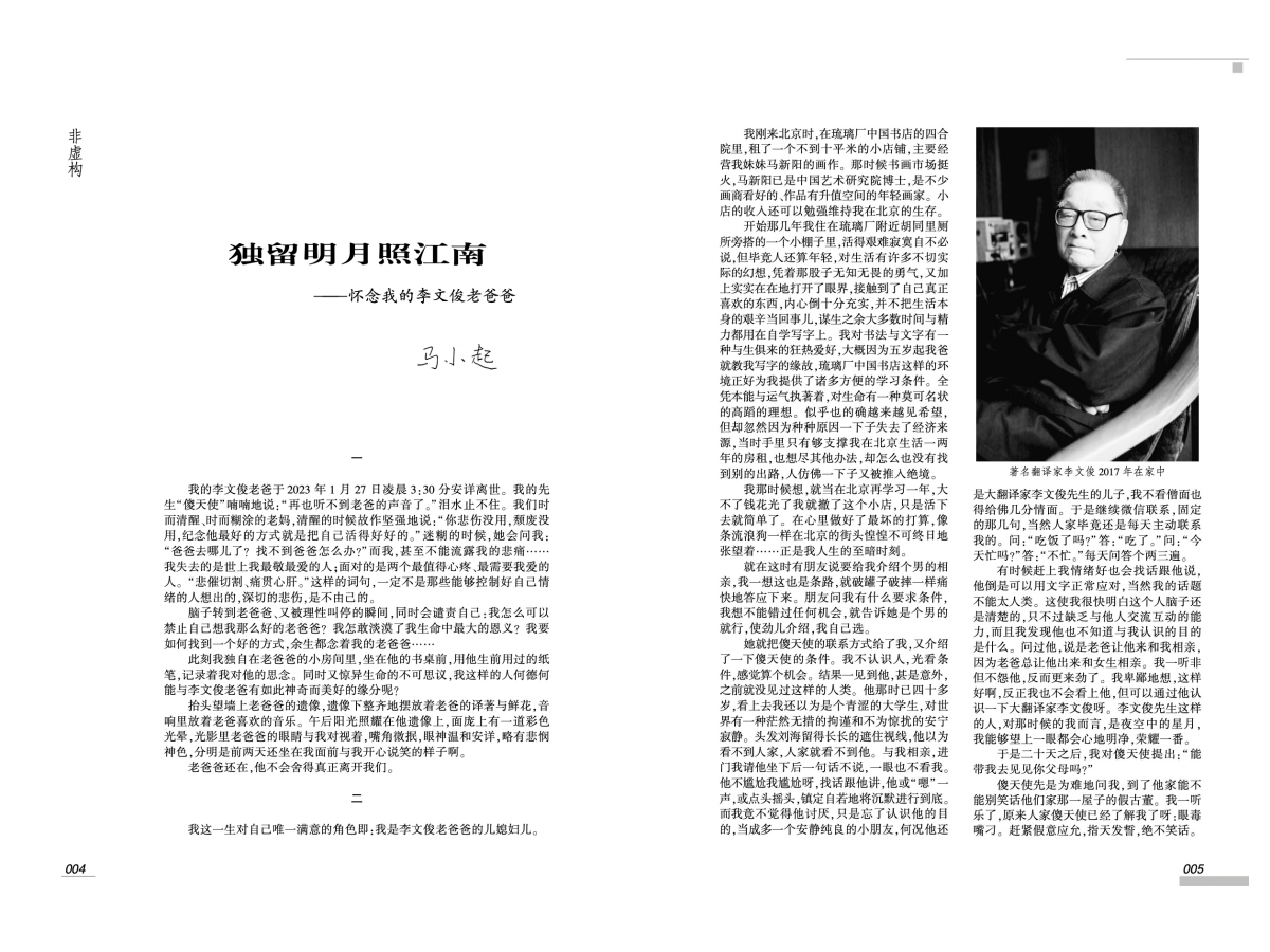 她并不喜欢过多地被人关注。2023年,因为一篇发在《收获》上的《独留明月照江南——怀念我的李文俊老爸爸》,作为“翻译家李文俊的儿媳”的马小起,开始为更多陌生人知晓。
