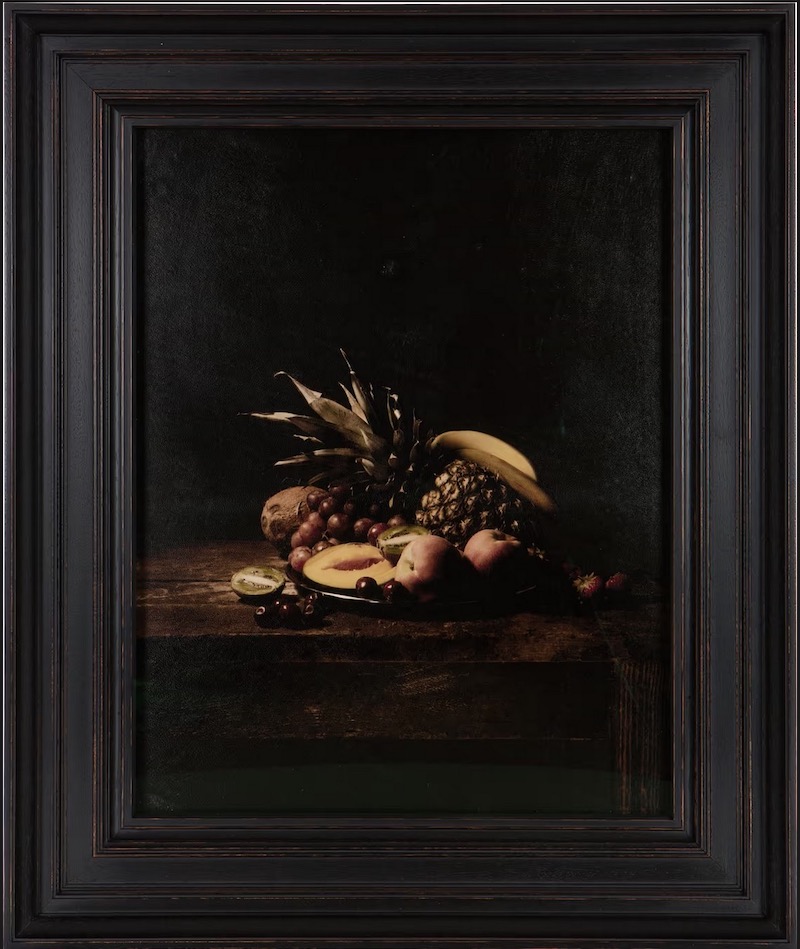 在英国,静物画的起源可以追溯到荷兰,就像许多其他美好的事物一样,静物画也是一种舶来品。早期的静物画属于“虚无主义”,即将世俗物品与死亡的象征物一同绘制,也有着纪念“死亡”的传统。展览的开端处悬挂了几幅古老的静物画,与现代作品进行了对话。帕特里克·考尔菲德(PatrickCaulfield)的丙烯画《预留的桌子》(ReservedTable,2000年)引用了荷兰黄金时代画家威廉·卡尔夫(WillemKalf)的《圣塞巴斯蒂安弓箭手协会的饮酒角、龙虾和玻璃杯静物》(StillLifeWiththeDrinking-HornoftheSaintSebastianArchers’Guild,LobsterandGlasses,约1653年),与后者的灵感相比,前者只是一个廉价的视觉的插科打诨。但当你看到马特·科利肖(MatCollishaw)的《德克萨斯州死囚牢里的最后一餐》(LastMealonDeathRow,Texas,2012年)时,作品远看像是出自一位老大师之手,但实际上是一幅数码转印作品。一旦你了解到它所描绘的异国水果代表的是一名真正的囚犯在注射死刑前不久提出的要求,那么它那一尘不染、香甜可口的外表就荡然无存了。