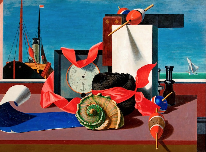 这种关系在瑞秋·怀特雷德(RachelWhiteread)于1991年创作的雕塑作品《无题(粉色躯干)》(Untitled(PinkTorso))中达到了顶峰。在这件作品中,“缺失”在一些粉色牙科石膏的作用下,变成了实实在在的存在。在帕兰特画廊的展厅里,你每时每刻都能感受到这种联系。那些精心摆放一系列物品的画作给人的感觉是舞台化和无意义的挑战,就像一个出错的茶盘记忆游戏。梅雷迪斯·弗兰普顿(MeredithFrampton)的《审判与错误》(TrialandError,1939年)由一个梨、一个骨灰盒、几把剪刀,一个人体模型的头和其他东西组成,虽然经过深思熟虑,却显得毫无生气。爱德华·沃兹沃斯(EdwardWadsworth)的《明亮的间隙》(BrightIntervals,1928年)是一场航海盛会,由一个贝壳、望远镜和许多钓鱼浮标组成,但却平淡至极。这两幅作品都属于战争时期,当时流行时尚的“结构目的”,用保罗·纳什(PaulNash)的话说,“这是对布鲁姆斯伯里团体(Bloomsburygroup)及其受塞尚启发而创作的模糊果盘的讽刺。”