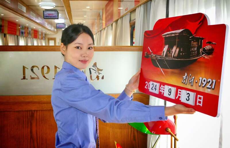 “南湖·1921”红色旅游列车自2021年6月25日正式开行,拉开了新时代“重走一大路”红色主题旅游的序幕。其“开天辟地、革命启航”线路入选“建党百年红色旅游百条精品线路”。作为长三角首趟常态化运营的短途标杆红色旅游列车,其专门设置两节功能车厢,内有“火车邮局”“党史学习角”和老照片展示等功能区域,木制座椅、内饰等复原了上个世纪20年代的古朴风格,浓厚的红色文化氛围广受游客欢迎。截至目前,该列车共接待团队400余个、旅客27万余名。