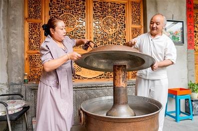在院内,一口口径为88厘米的铜锅十分惹眼,铜锅上以龙、虎、狮、大鹏等神兽为錾刻图样。金维达告诉记者,这口铜锅是4名工匠耗费4个月才制成的,是仅次于湟中区201.9厘米口径的特大暖锅。