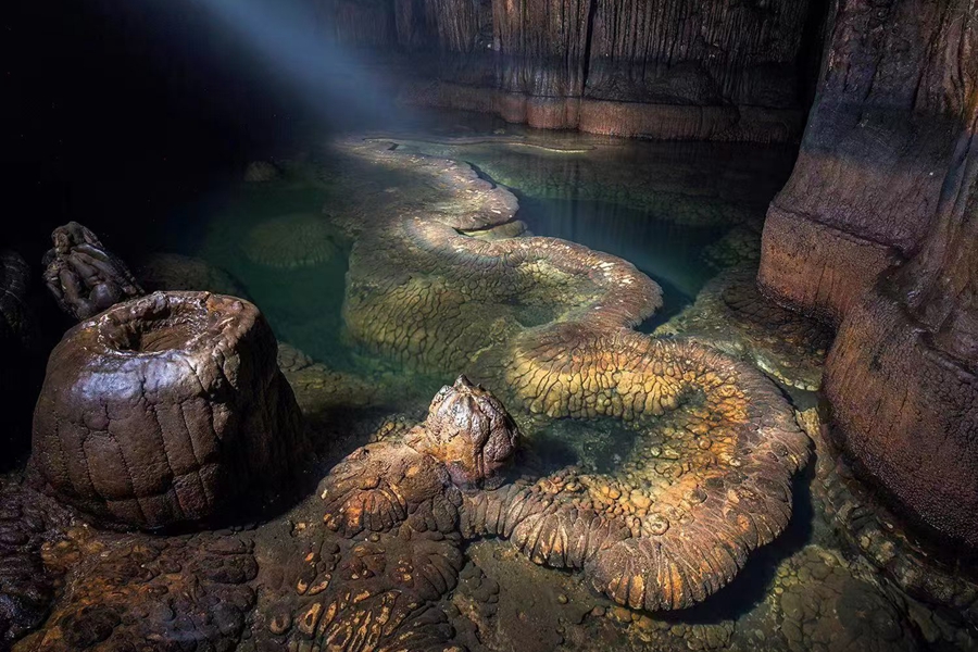 暗淡灯光下,石质的龙眼、龙嘴、龙颔、龙鳞和龙爪熠熠生辉,清晰可辨。它似乎正在腾飞天宇前的短暂蛰伏,龙首顶着脚下的池沼横坎,龙尾隐于池水深处,长13米左右,粗约0.8米。龙颔下现一颗圆润石头,犹如日常悬挂的“宝珠”。一旁则突兀耸出另一圆石,中有偌大臼窝,恰能盛下“宝珠”,必是空着的“珠盘”了。卧龙的神态、模样,与千百年来人们无数次想象,却仅见于画卷雕塑的中华龙毫无二致。作为图腾的中华龙,最多不过万年,而池水中盘踞的龙,地质学家考证已有上亿年。或许,中华龙的形象正来源此吧?