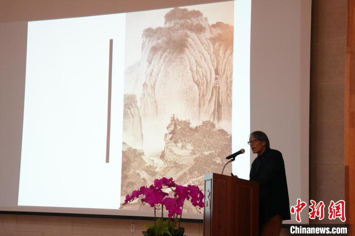 9月6日,第十五届光州双年展中国馆在韩国光州金峰美术馆举行开幕式。图为中国国家画院研究员白羽平在开幕式后做演讲。 中新社记者刘旭摄