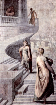 《去见大卫王的拔示巴》绘制于1552年到1554年之间。萨尔维提应该是受到同时期意大利画家蓬托尔莫《约瑟与雅各在埃及》(图2)的启发,此图也是柱式城堡,有旋梯,三段进程顺着旋梯发生,最后结束在城堡幽暗的室内。旋梯上也两次出现了绿衣服。