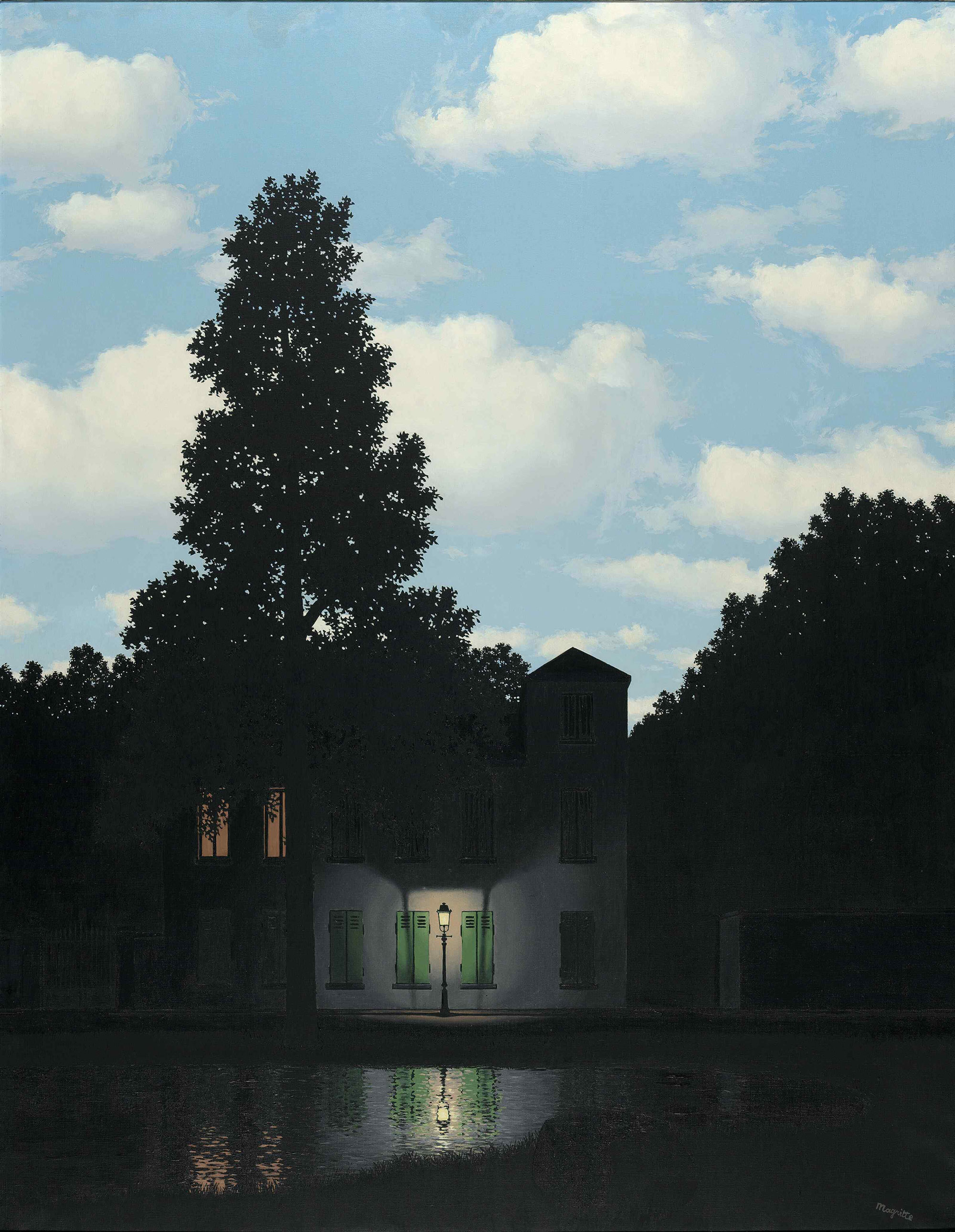 尽管展览将在巡展过程中不断演变,但部分布鲁塞尔展出的作品已在巴黎亮相,比如,比利时皇家美术馆将其馆藏的瑰宝之一马格利特的《光明帝国》(TheDominionofLight)借展蓬皮杜中心。这幅作品呈现了蓝天白云下的树木和房屋,却笼罩在夜晚的光线中。马格利特曾引用布勒东1923年的诗句:“要是太阳今晚能照耀就好了。”