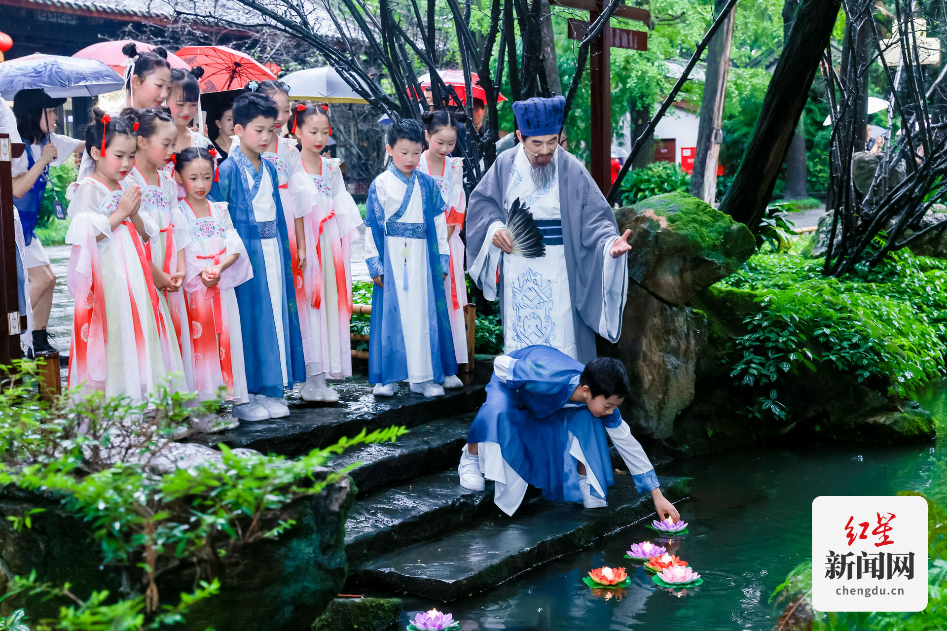 随后,“诸葛亮”带领小朋友巡游至锦里古街。巡游队伍缓缓前行,一路上,小朋友们向来往的观众行传统汉礼,并将“兔子灯”作为中秋礼物送给观众。