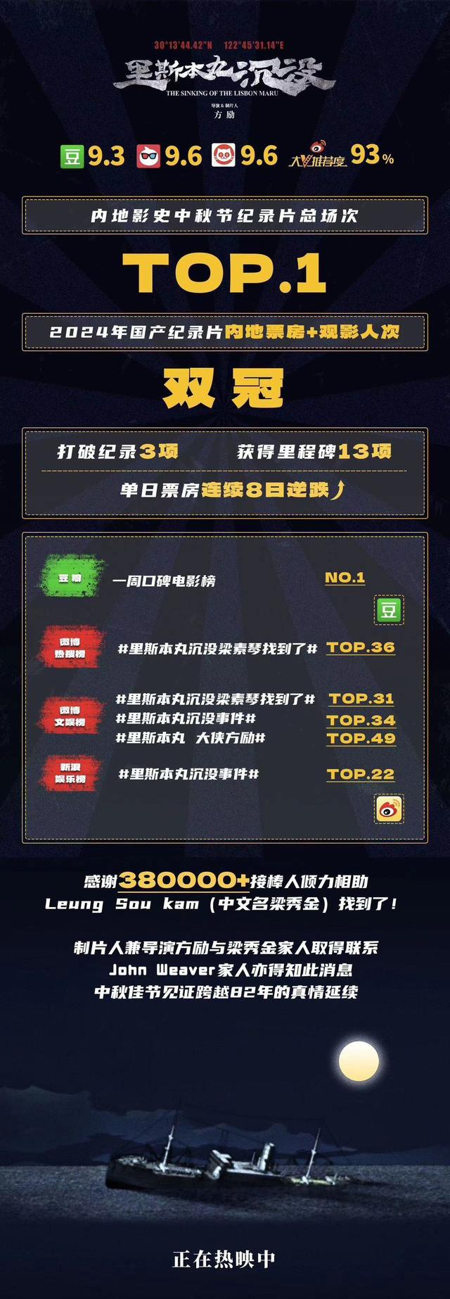 在这个中秋假期,越来越多的“接棒人”观影《里斯本丸沉没》并呼吁增加排片,使得影片单日票房逐渐攀升。据灯塔专业版数据,截至9月17日23时,《里斯本丸沉没》票房已破1600万,成为2024年国产纪录片内地票房冠军及2024年国产纪录片观影人次冠军。