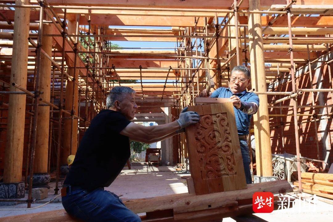 扬子晚报网9月24日讯(记者 郭一鹏 通讯员 魏宏伟) 斗拱飞檐,雕梁画栋……9月23日,能工巧匠们正在南京高淳区古柏街道三保村中保魏氏宗祠前厅复建工程现场,进行枋梁、柱子装配选架施工作业。