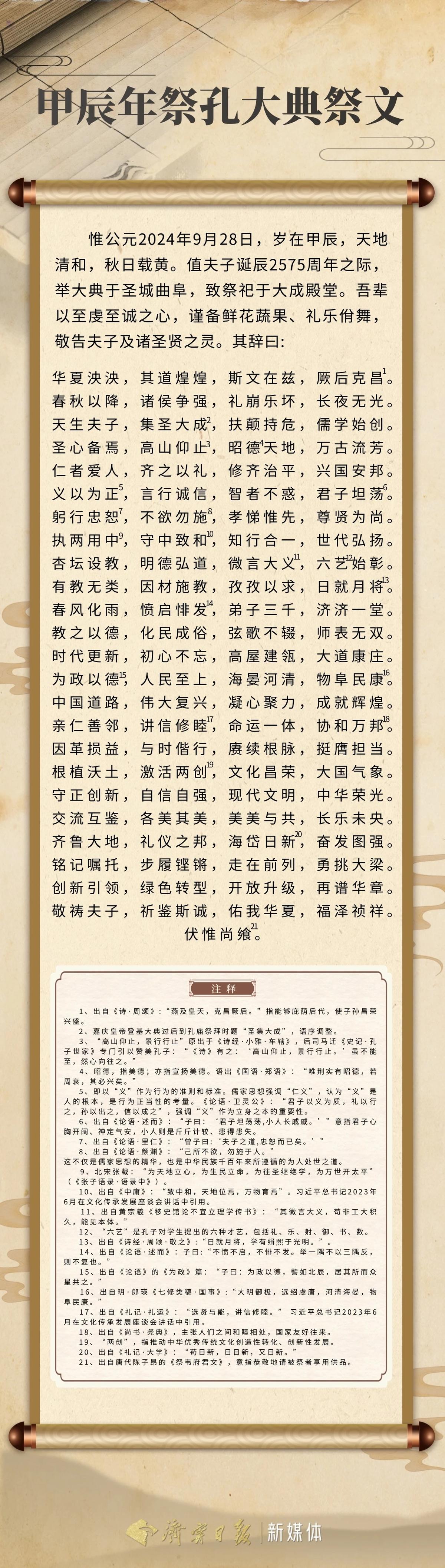 9月28日上午,甲辰年公祭孔子大典在曲阜孔庙正式开幕。以下为2024(甲辰)祭孔大典祭文。