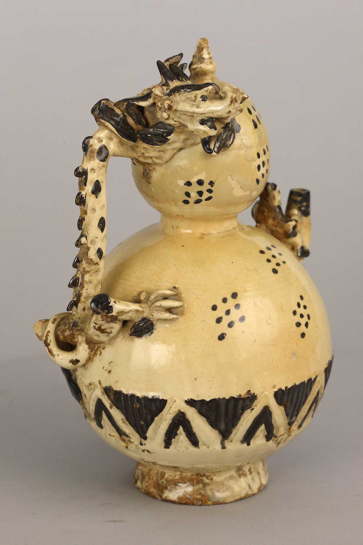 绿釉花蕃草纹双孔鸡冠壶,为辽代陶瓷的代表性器物,源于契丹