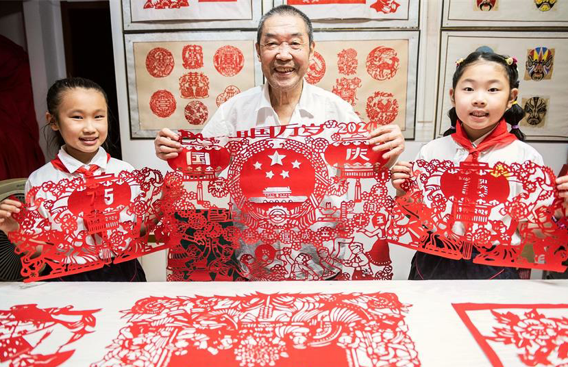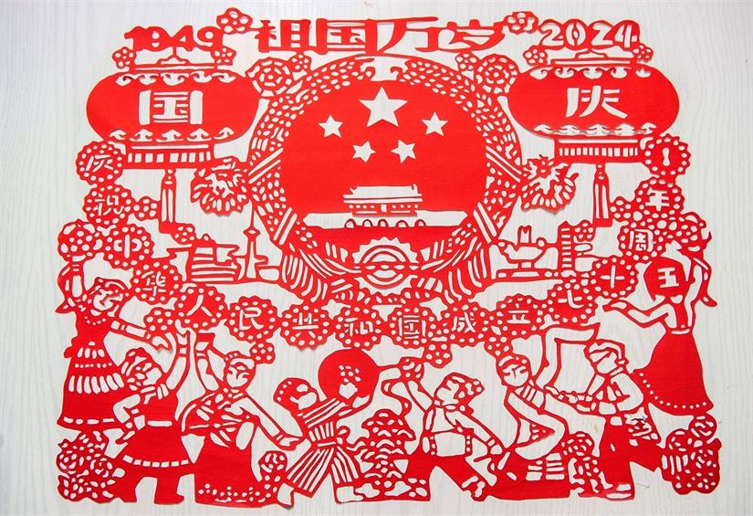 今年是中华人民共和国成立75周年。洪诗成老人看到祖国翻天覆地的变化,心存感激,在国庆来临之际,剪了7幅剪纸作品来表达自己对祖国的祝福,希望祖国更强、更美、更昌盛。
