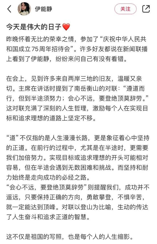 10月1日上午10点49分,伊能静通过个人微博发文,表达自己的荣幸与感激之情。