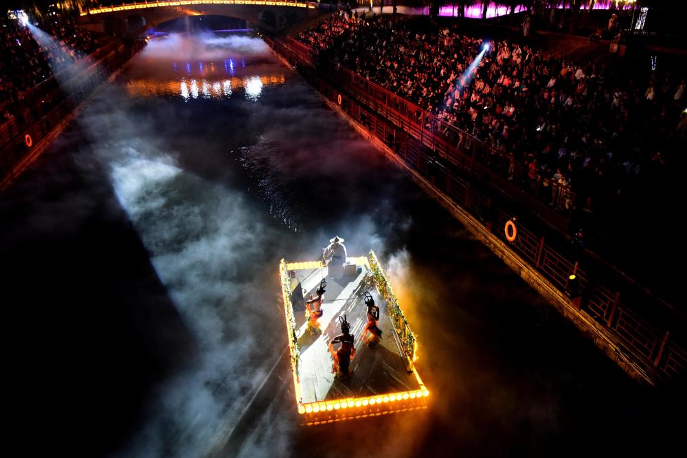 10月4日,河南省巩义市杜甫故里景区演员在表演实景剧《归乡》。新华社记者 朱祥 摄