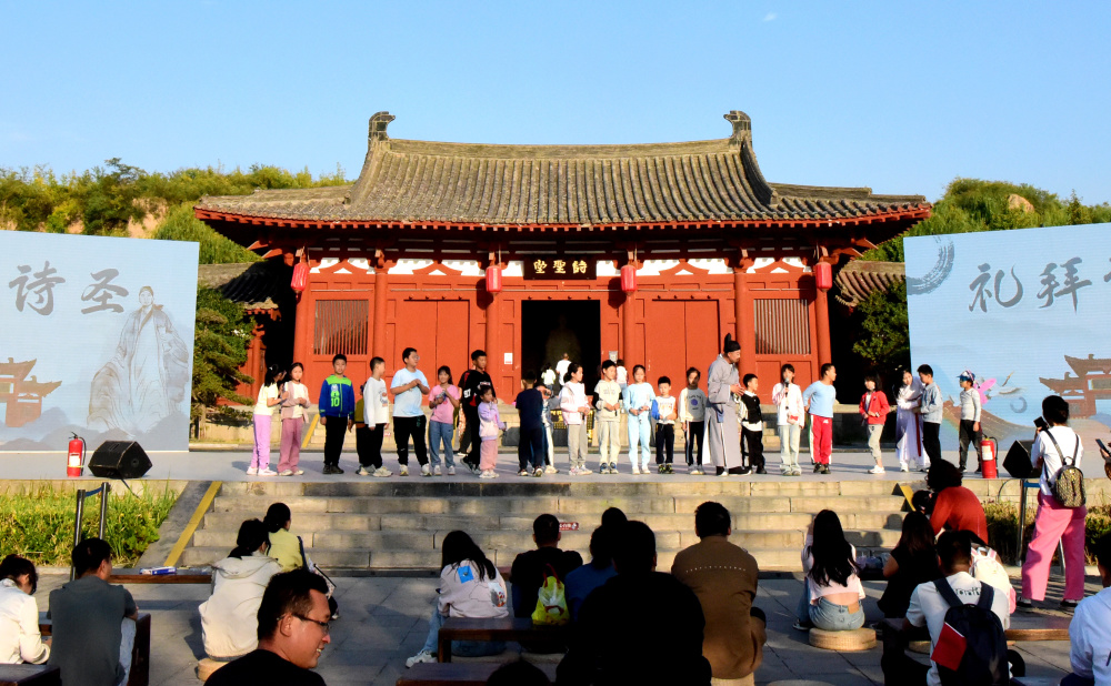 10月4日,游客在河南省巩义市杜甫故里景区参加“礼拜诗圣”互动活动。新华社记者 朱祥 摄
